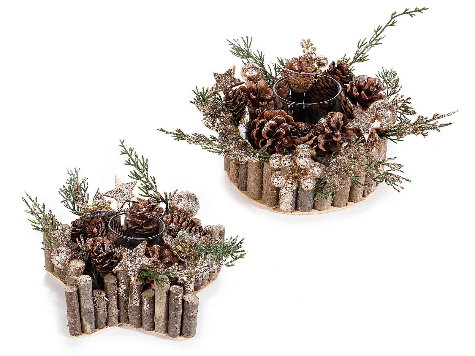 Centrotavola legno c/vasetto portacandela, pigne e decori