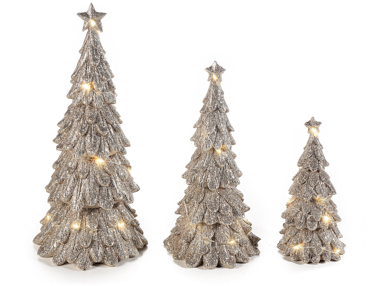 Set 3 alberi in resina glitterata c/luce LED bianco caldo