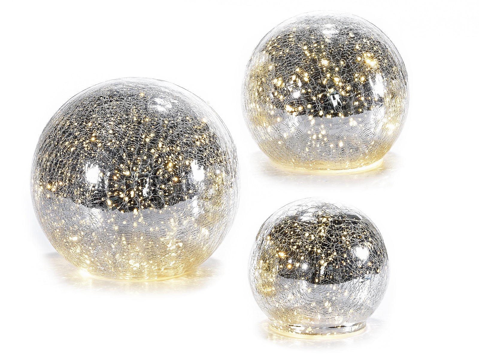 Set 3 lampade sfera argento c/luce led bianco caldo e timer