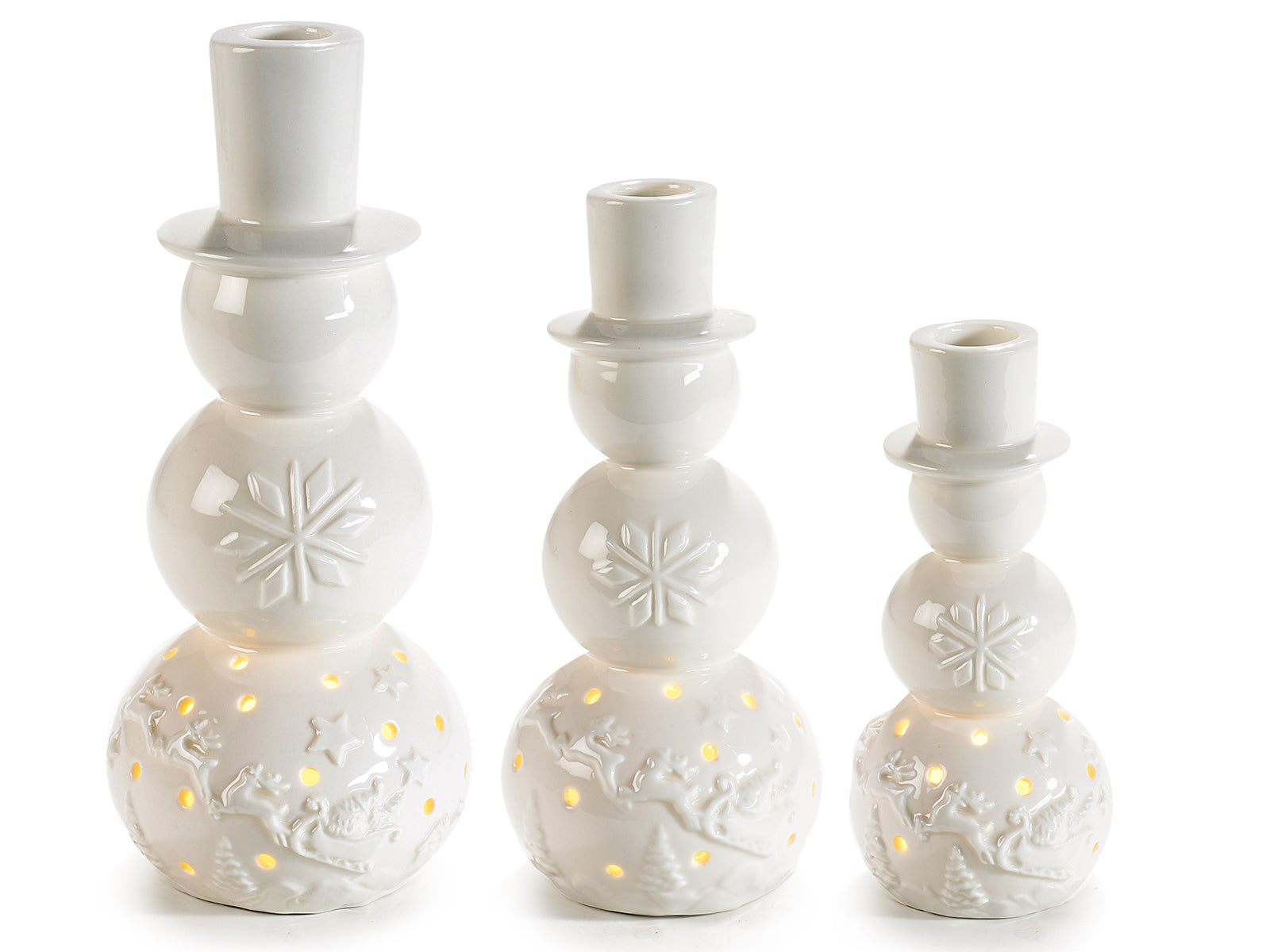 Set 3 pupazzi di neve portacandela in porcellana c/luci LED